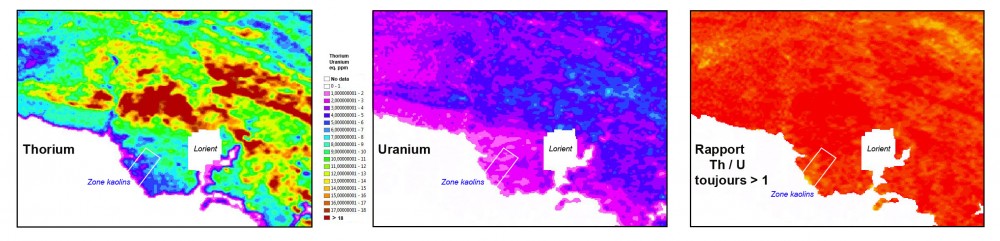 Je vais faire une courte digression, les pyrénéens (et les autres) m'en pardonneront : je suis quand même assez étonné par ce que tu dis. Je ne m'attendais pas à des résultats comme ceux-là. Voici les cartes (agrandissables) issues des mesures aéroportées pour le Thorium et l'Uranium d'un coin où se situe un granite à altération kaolinique (hydrothermale et météorique): gisement bien connu ! Ces cartes montrent que, même si les teneurs équivalentes en ppm pour Th et U restent faibles, Th est toujours supérieur à U [échelle commune aux deux cartes]. Ceci se traduit naturellement par un rapport Th/U toujours > 1...Pourquoi y-a t-il donc contradiction apparente avec les mesures aéroportées et les mesures de terrain ? (fin de digression)...
