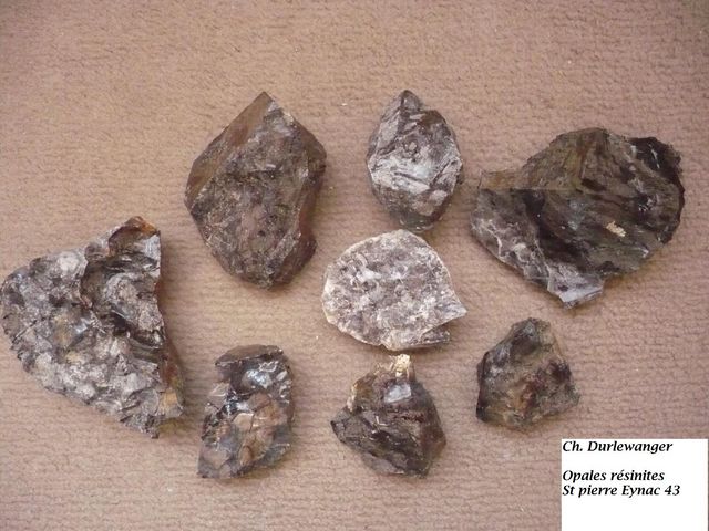 pour voir ces opales résinites locales marbrées de marron, gris et noir.
