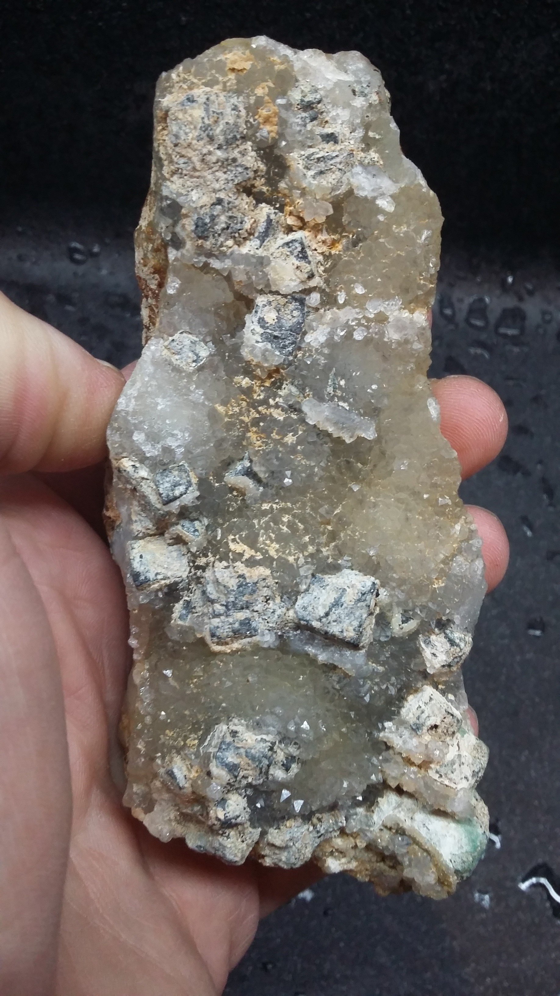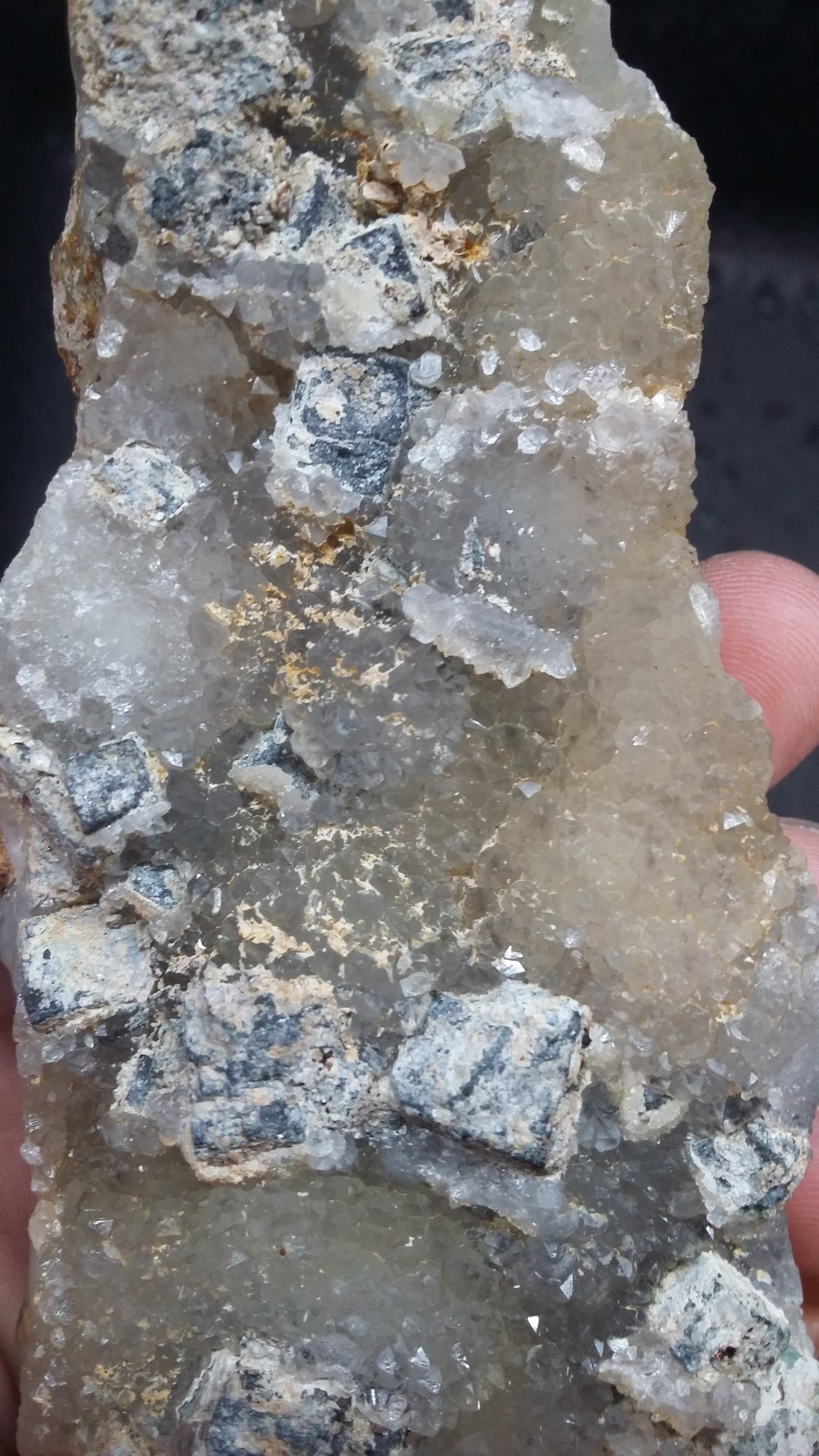 Voici donc 2 photos de l'échantillon pour tenter de confirmer la nature du dépôt sur les galènes. Si je pars sur l'acide phosphorique, quel temps de trempage faut-il compter? Je me doute bien que les cubes de galène ne retrouveront pas leur brillant d'origine (si cela fut le cas un jour) après tant d'années passées en extérieur mais si je parviens à me débarrasser de ce dépôt blanc, je pense que le contraste avec le quartz peut être sympa malgré tout. Surtout pour un pièce trouvée dans des déblais.