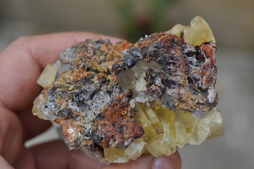 Voici la pièce en question (oxydes sur quartz sur fluo), avec justement des cubes aux faces assez brillantes, donc on exclue déjà le cristocline.