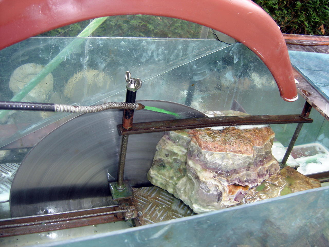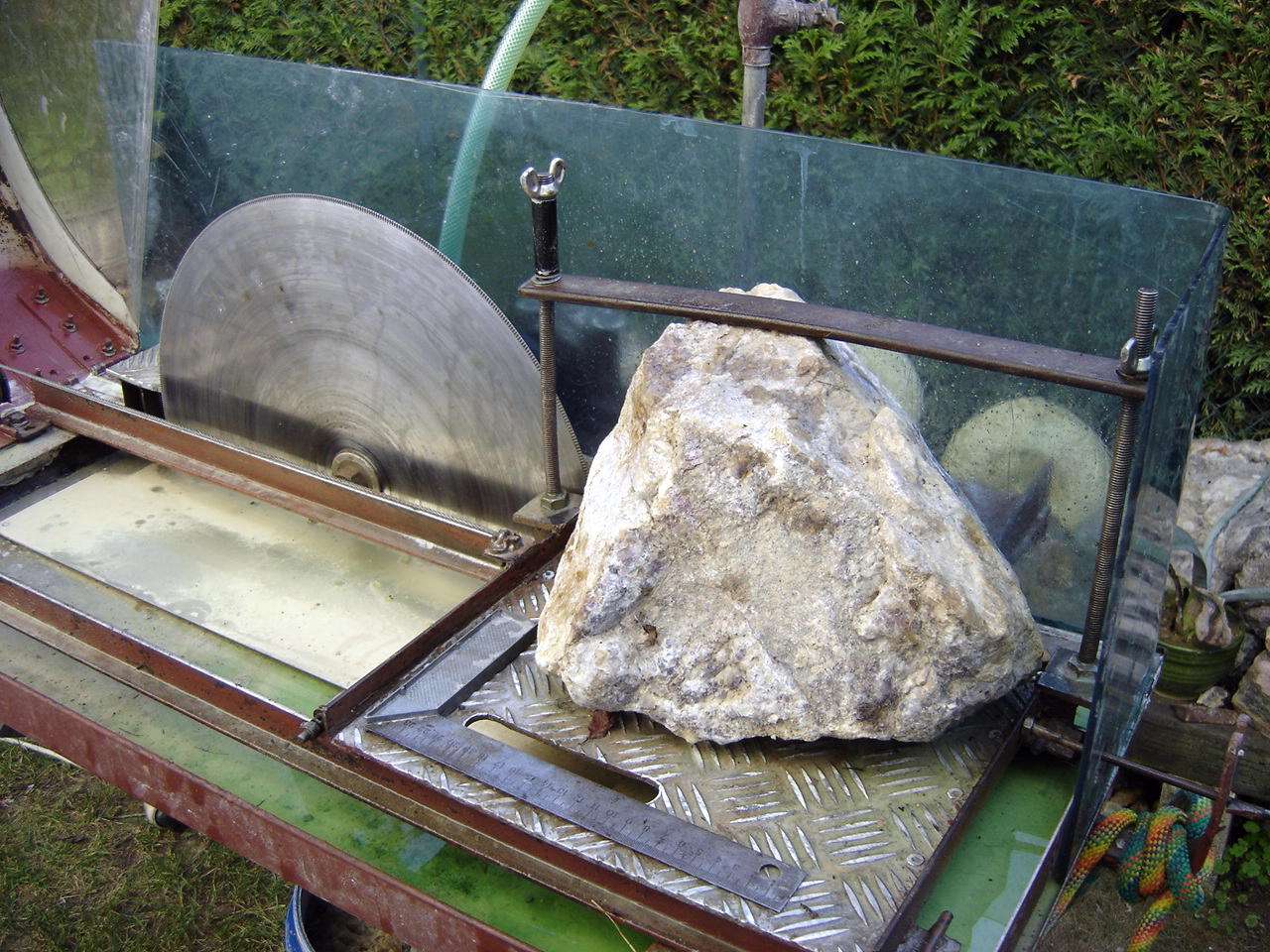 Avance automatique par contrepoids, nécessitant la surveillance constante de la coupe , car s'il se trouve un bout de quartz dans la fluo par exemple ça nécessite de veiller à ce que l'avance continue à même vitesse