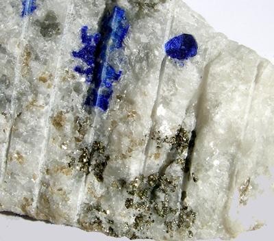 on y trouve de la calcite (blanche), de la pyrite ("jaune") et de la Lazurite (bleue)
