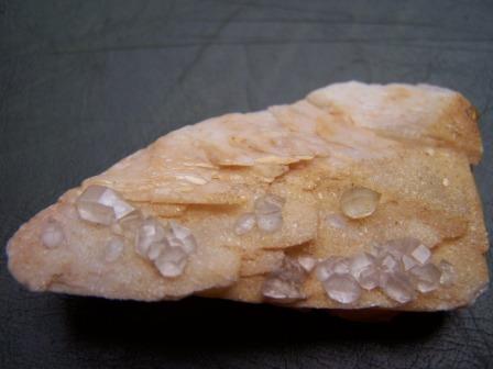 - des quartz limpides biterminés sur des feuillets de barytine de la mine Molimard, à Pissis (7 x 4 x 1 cm)