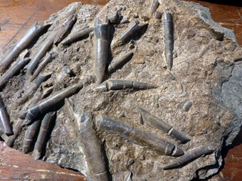 Un plaque avec des belemnites, des Ardennes... et maintenant dans mon jardin.