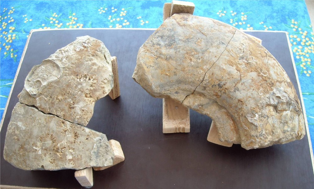 J'ai trouvé cette ammonite (les morceaux étaient déjà séparés) dans des marnes du Lias d'Alsace (dans une ancienne carrière). Un guide indique que les marnes datent du Pliensbachien (on trouve Amaltheus margaritatus), mais j'ai également trouvé d'autres ammonites qui sont, d'après moi, Echioceras raricostatum (Sinémurien) et Schlotheimia angulata (Hettangien supérieure). Peut être que l'on a creuser plus profond et atteint les étages plus anciens, car le guide est très vieux ( on trouve aussi Plagiostoma giganteum et des gryphées).