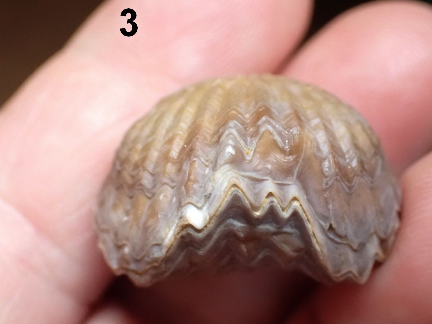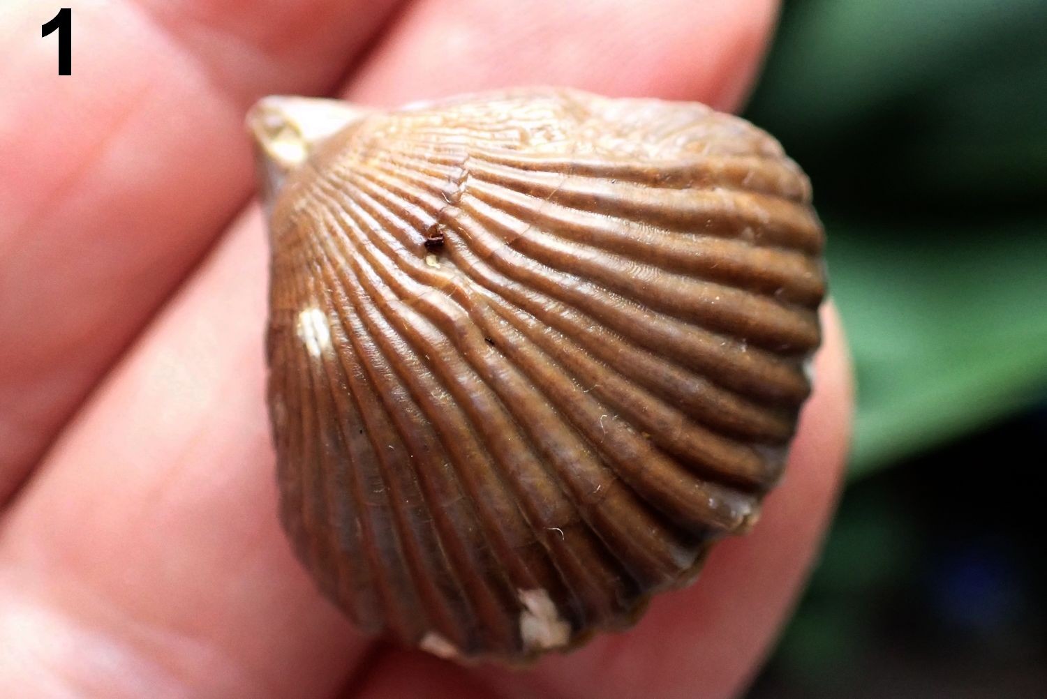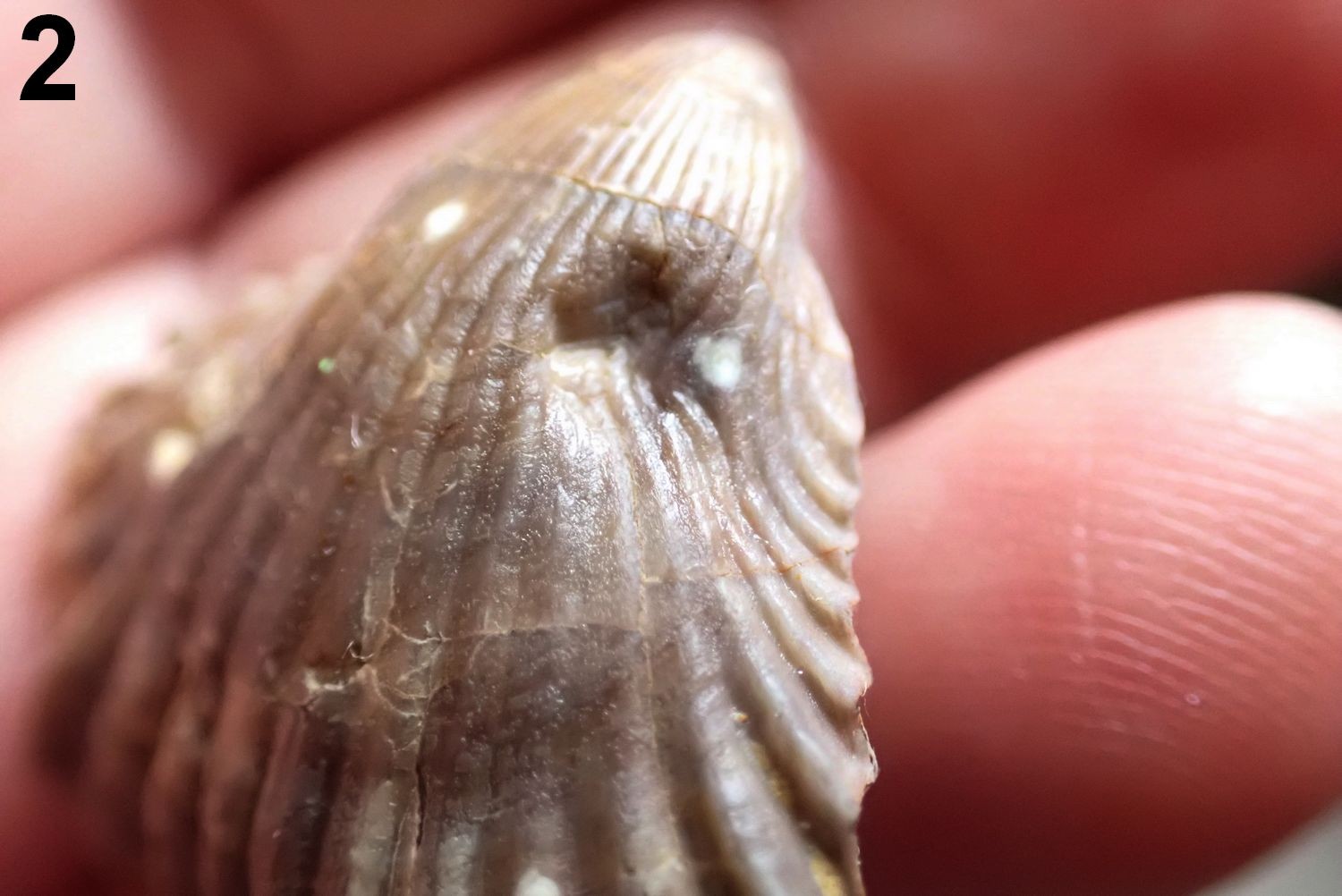La pathologie de la Septaliphoria orbignyana n°3 est différente. Pas de "point d'impact" sur sa coquille comme les deux précédentes mais une commissure frontale double, du moins sur une partie.