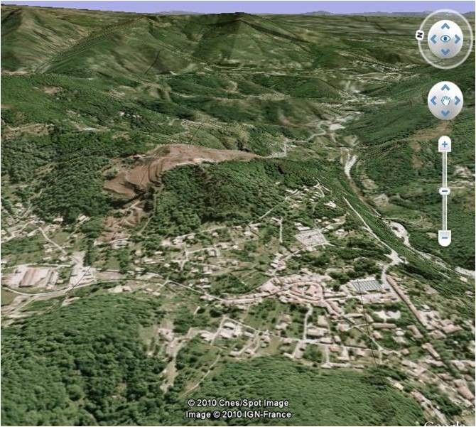 Au fond de la vallée il s'agit du village de Montpezat. Alors à droite juste en limite de champ, il y a le cône strombolien de la Gravenne de Montpezat. Et à gauche hors champ il y a le maar de la Vestide du Pal.