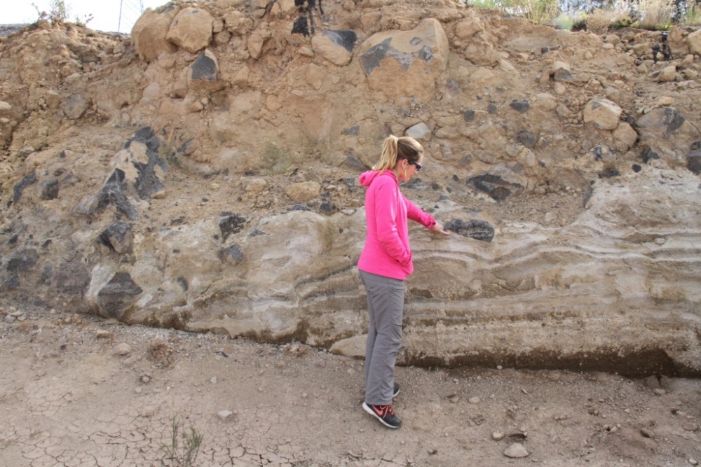 Une coupe dans la base de l'avalanche permet de voir la déformation des sédiments lacustres sous le mouvement de l'avalanche.