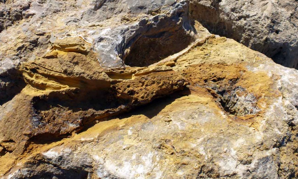 Sur une digue entre Carnon et Palavas composé de bloque de dolomie bajocienne (daté grocièrement grace au crinoide, térébratules, huitre, etc...), j'ai trouvé dans un des bloques, quelques morceau d'os de thalattosuchia (peut-être metriorhynchidé?)