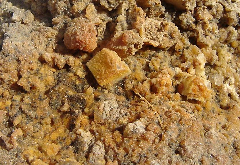 Une calcite transformée en sidérite (pseudomorphose), puis de nouveau un dépôt de calcite. Peyrebrune, Tarn.