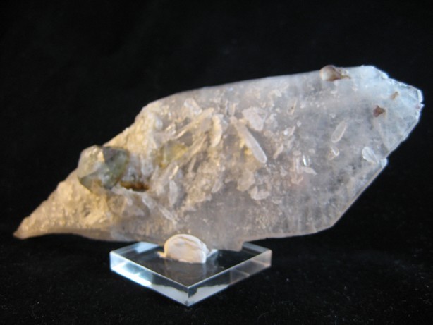 Alors, il y a une série de minéraux : fluorite violette d'Okorusu, un quartz, préhnite, calcite et épidote de Goboboseb (Brandberg région), orthose et hyalite, Erongo massif et un magnifique cristal sceptre de 7 cm, améthyste, fumé, fenêtré, enhydro (2 bulles).
