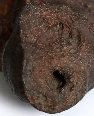 Il semble qu'elle ait été utilisée par l'homme car elle possède un trou à chacune de ses extrémités. De près elle semble constituée de grains très fins agrégés.