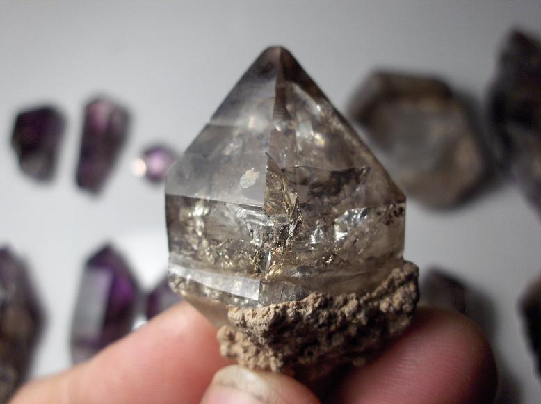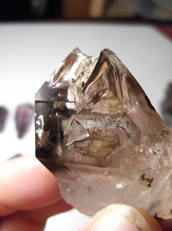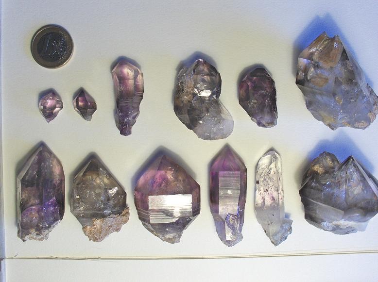 Mais c’est finalement sur deux petites tables, ou s’entassent quelques échantillons, à première vue sans grand intérêts, que se porte toute mon attention. En y regardant de plus près, il s’agit uniquement de minéraux en provenance de Namibie. Dans un carton :triste: s’entrechoc négligemment des morceaux de quartz. Après une brève observation, il apparaît que ces quartz cumulent les caractéristiques remarquables : :surpris: Couleurs zonées (à la fois fumé, hyalin, et améthysé avec fantômes de croissance), cristaux fenestrés, sceptre, biterminés, avec inclusions diverse (Gazeuse, Hématite, Argile) !!!