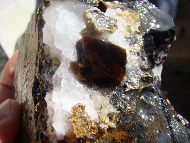 une sphalérite avec calcite, quartz et oxyde. 1,3 cm pour le sulfure.