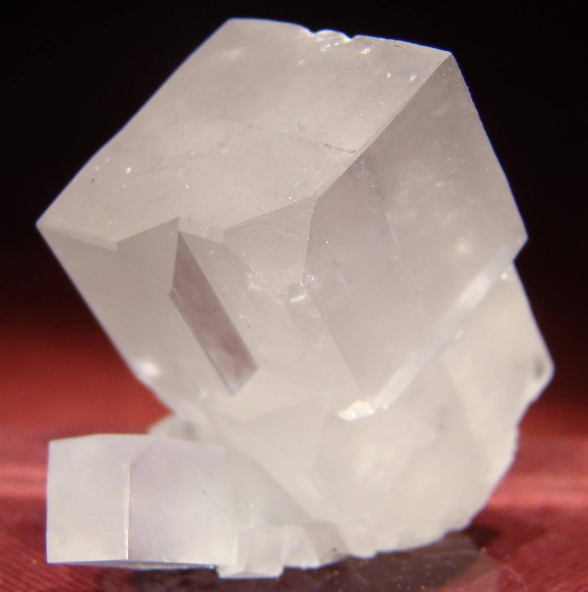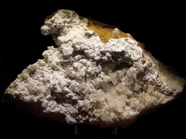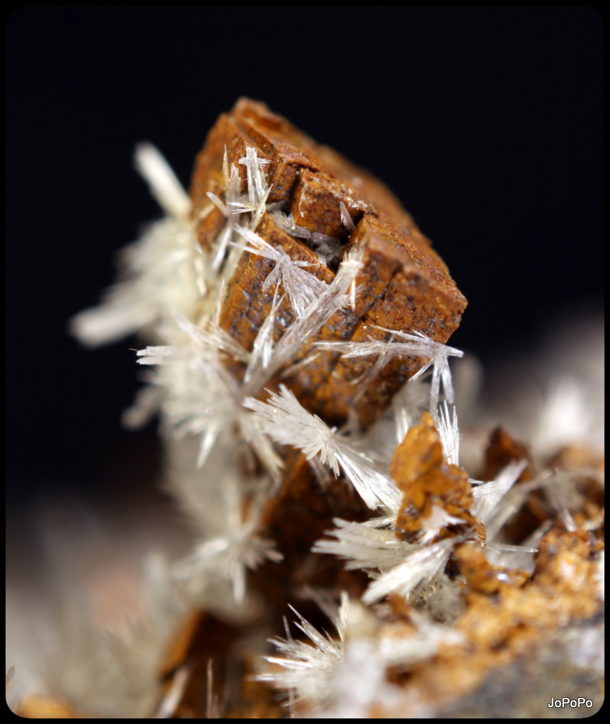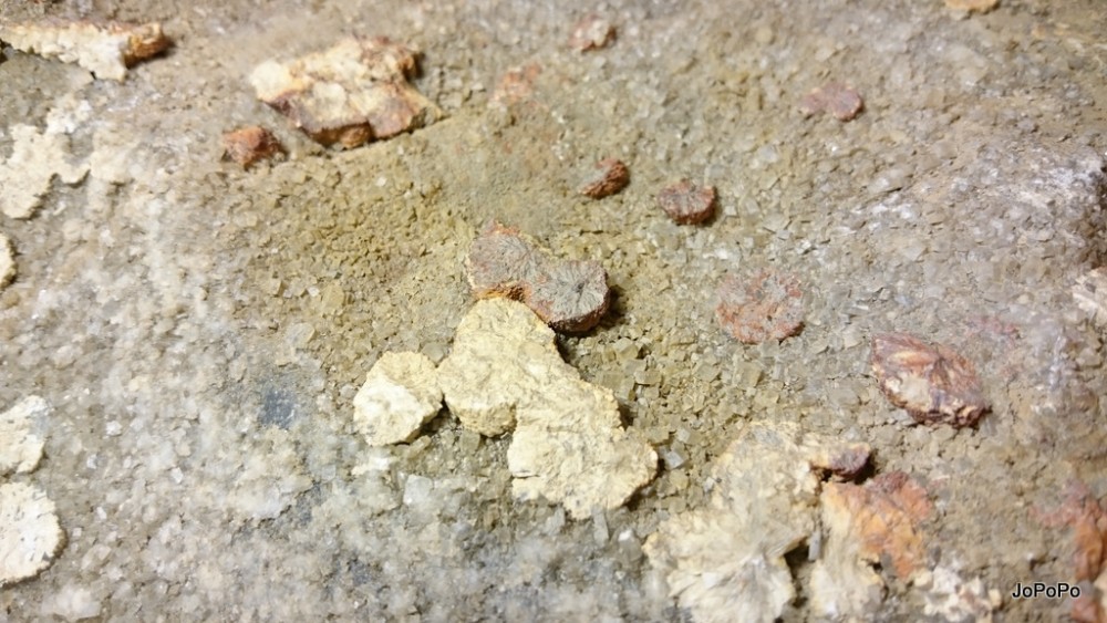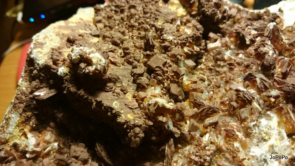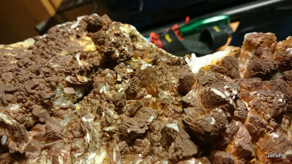 - détail partie rouge où l'on remarque que la couche de Baryte en pompons est venue par dessus une 1ère génération de Calcite