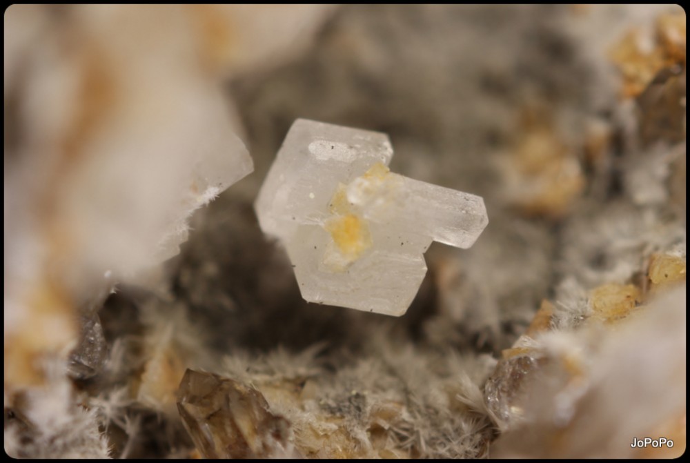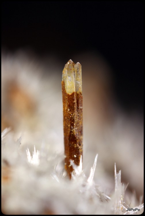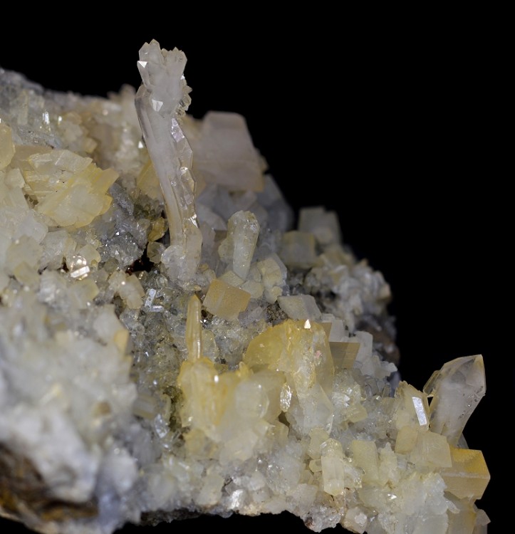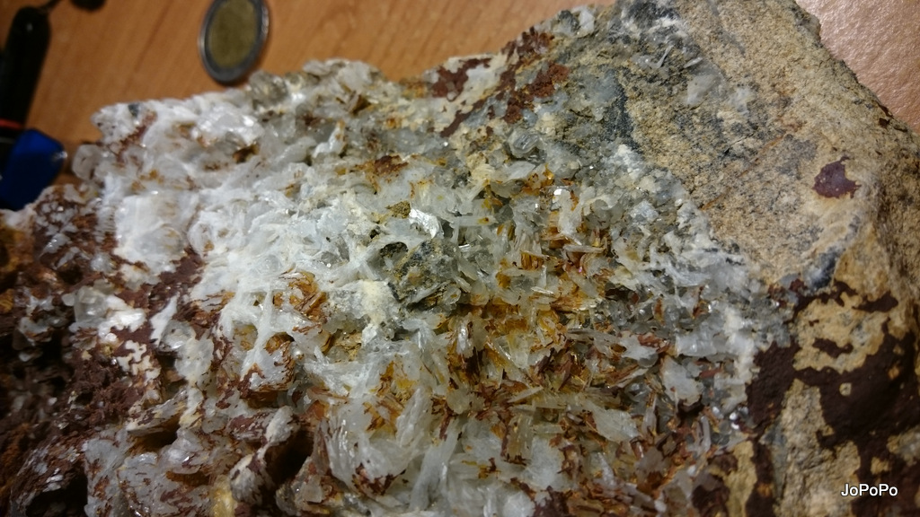 Quartz à âme de 4cm courbé devant une fracture tapissée d'ankérite oxydée. Un autre tabulaire sympa en bas à gauche de 17mm et un prismatique de 18mm courbé aussi. La zone à cristaux fait 14cm x 14,5cm.