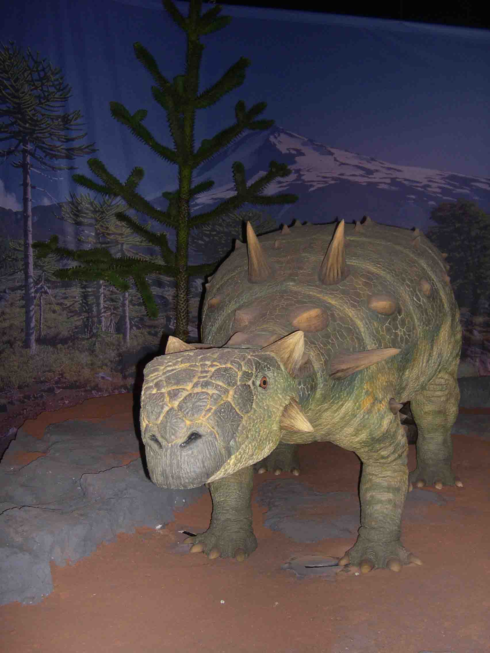 l'Euoplocephalus est présenté dans un décort peint comme l'Iguanodon, avec au fond un Araucaria.