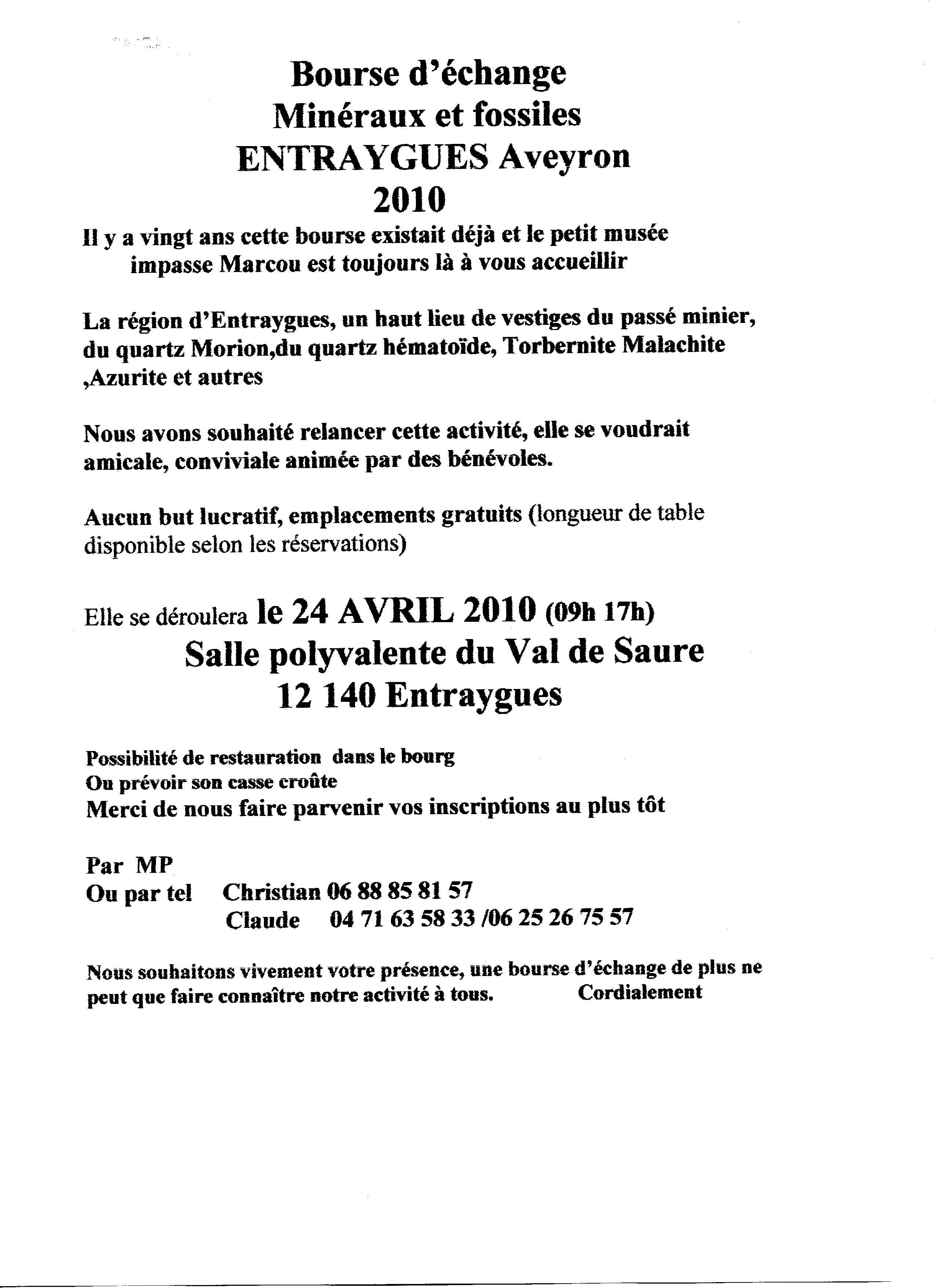 J'ai fait l'annonce de la bourse d'Entraygues au club la semaine dernière et nous avons au programme une sortie ce week-end là. Il est certain que je serai des vôtres pour la relance de cette bourse d'échanges.