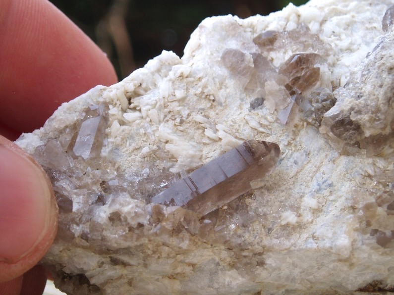 J' ai été invité à voir les pièces, chez l' auteur de la trouvaille : les quartz sont beaucoup plus grand en général ( 6 ou 7 cm maxi. de visu. ), ils sont associés à de l' albite et présentent parfois des fantômes blanc....ils sont vraiment magnifiques, brillant, limpide et forme de véritables pièces avec plusieurs pointes associées, et parfois des biterminés.