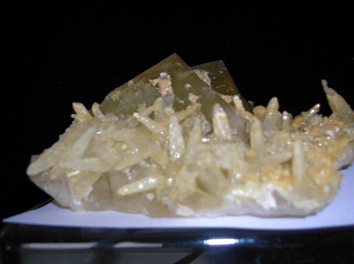Cristaux particuliers dont j'ignore le type de cristallisation,cependant, recouverte par une très fine couche de silice et saupoudré par d'autres cristaux plutot cubique (vue à la bino).