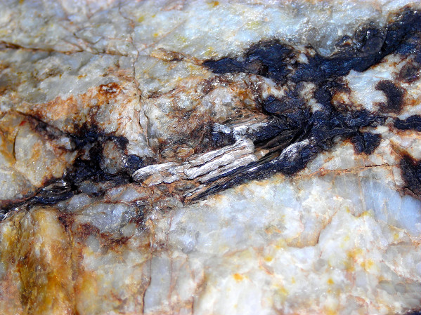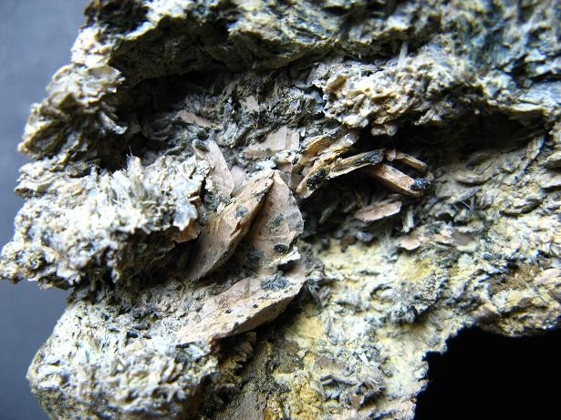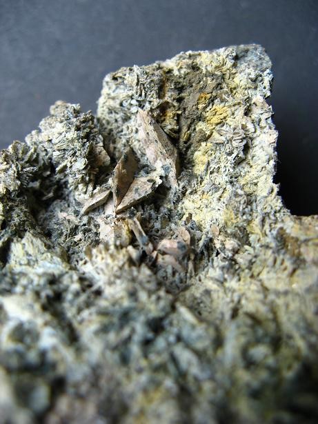 1franquin: salut, le deuxième minéral fait 1,2cm, au début j'hésité avec une muscovite. Mais l'auréole noire qui est autour ressemble à celle que l'on peut retrouver autour de l'argent des mines des Chalanches. Une aiguille y est facile à planter, donc ce minéral est plutôt tendre. Il ne semble pas se déliter en feuillets comme le mica. Seulement, la gangue est composée de muscovite. Il faudrait que je fasse un test à l'acide nitrique.