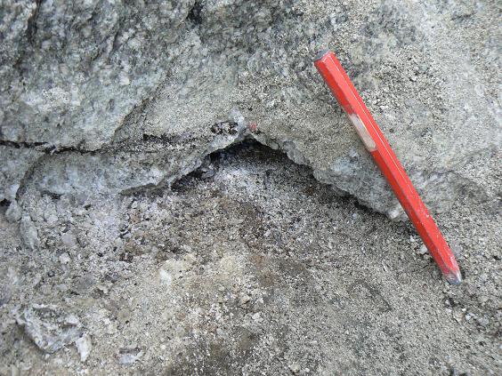 Un peu avant , j'y ai également cru en dégageant deux belles fissures faisant jusqu'à 20 cm de puissance. Malheureusement, ça n'a pas payé... Je n'ai peut-être pas assez insisté... Au passage, deux petites pointes sortie du fond d'un four qui a dû être exploité il y a maxi un an (elles étaient prises dans de la glaise qui a dû se ramollir, elles sont sorties toutes seules), puis une grosse pointe un peu beugnée, ramassée sur le glacier.