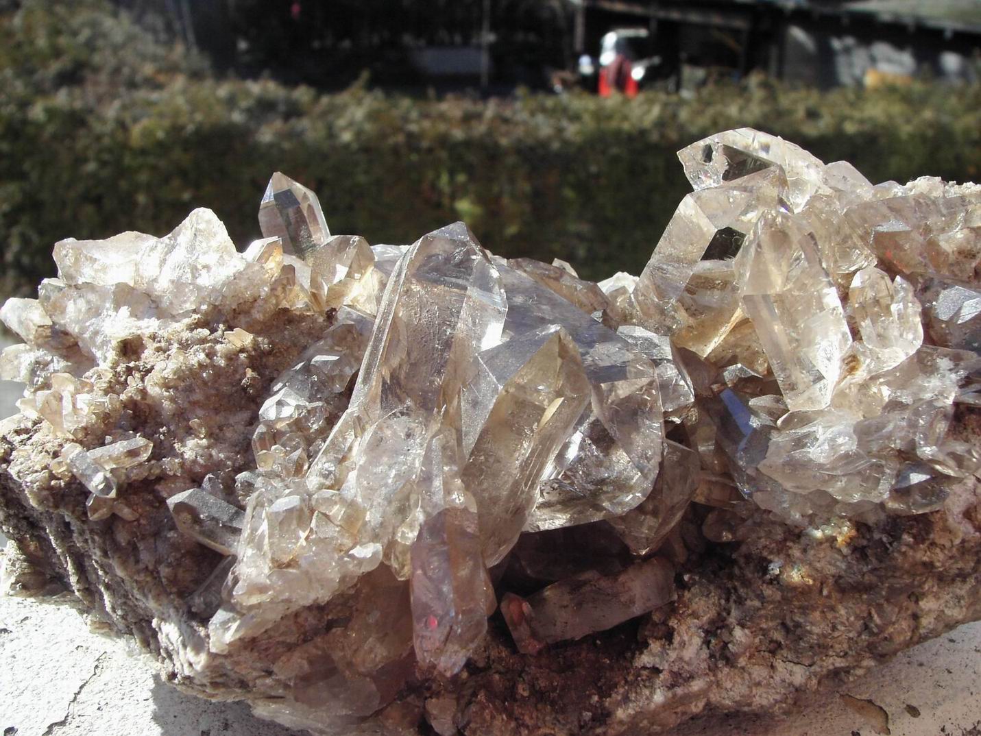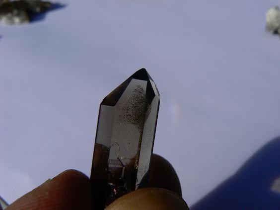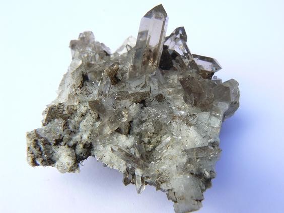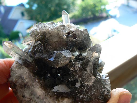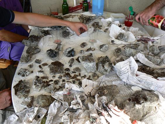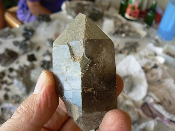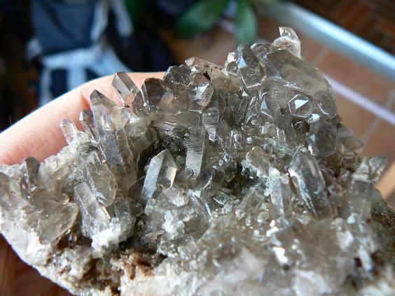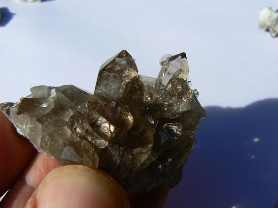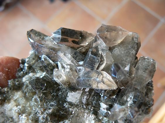 C'est mon ami M.. qui a trouvé une petite fissure de fumé. On l'a travaillée tous ensemble et 4 sacs n'étaient pas de trop pour descendre les pièces. Bilan : des groupes de petits fumés de très bonne qualité, avec quelques quartz chlorités à l'intérieur et présentant parfois des fantômes. Les pièces sont modestes en taille, mais on s'est bien fait plaisir.