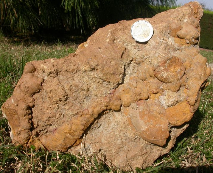 la photo fait furieusement pensé au gisement de fer exploité à la Verpilliière près de Lyon où de superbes blocs de minerai associé aux ammonites et belemnites du Toarcien peuvent êtres trouvés. Voici ce que j'ai trouvé grâce au net: