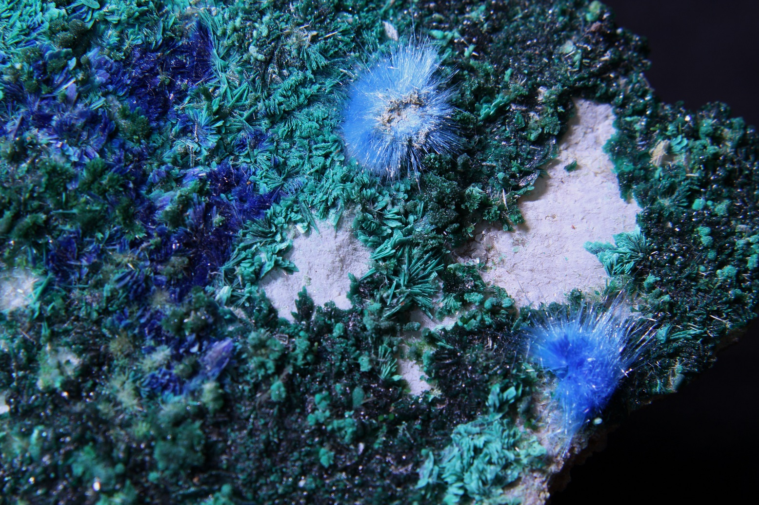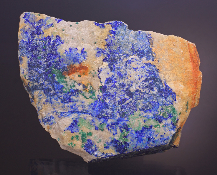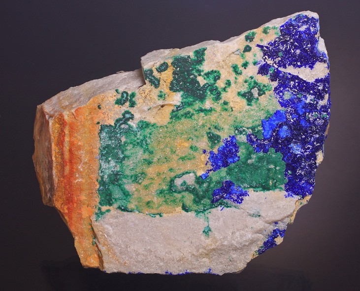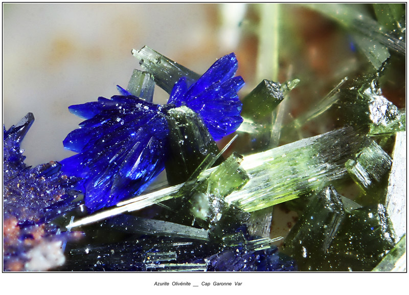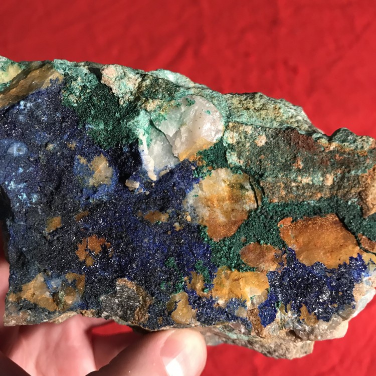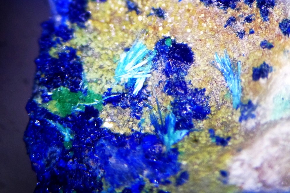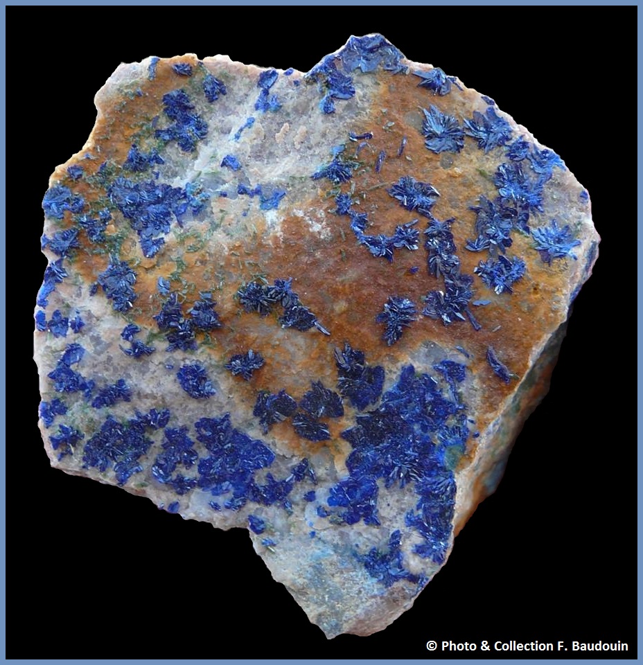 Superbe sujet, dans lequel j'ai personnellement découvert la diversité immense de ce gisement. Je viens tout juste d'acquérir le spécimen ci après, mais il va falloir que je le scrute à la bino pour rechercher peut être d'autres espèces que l'Azurite et Malachite ... ? je reviendrai surement avec d'autres photos macro pour vous demandez confirmation ... c'est l'une des richesse de ce forum !
