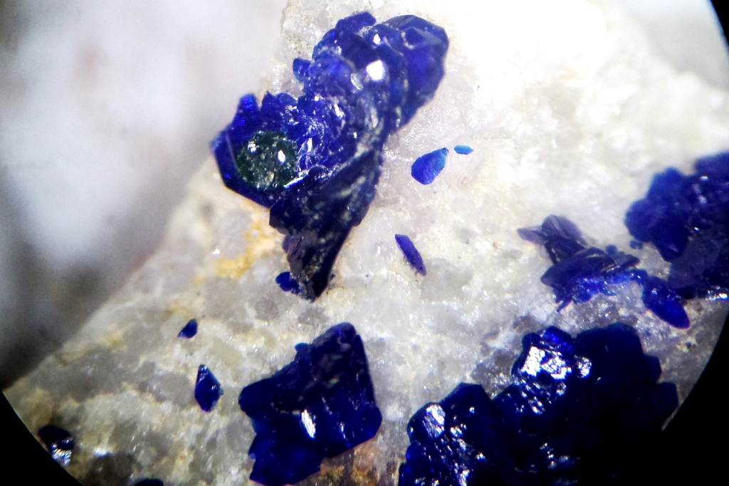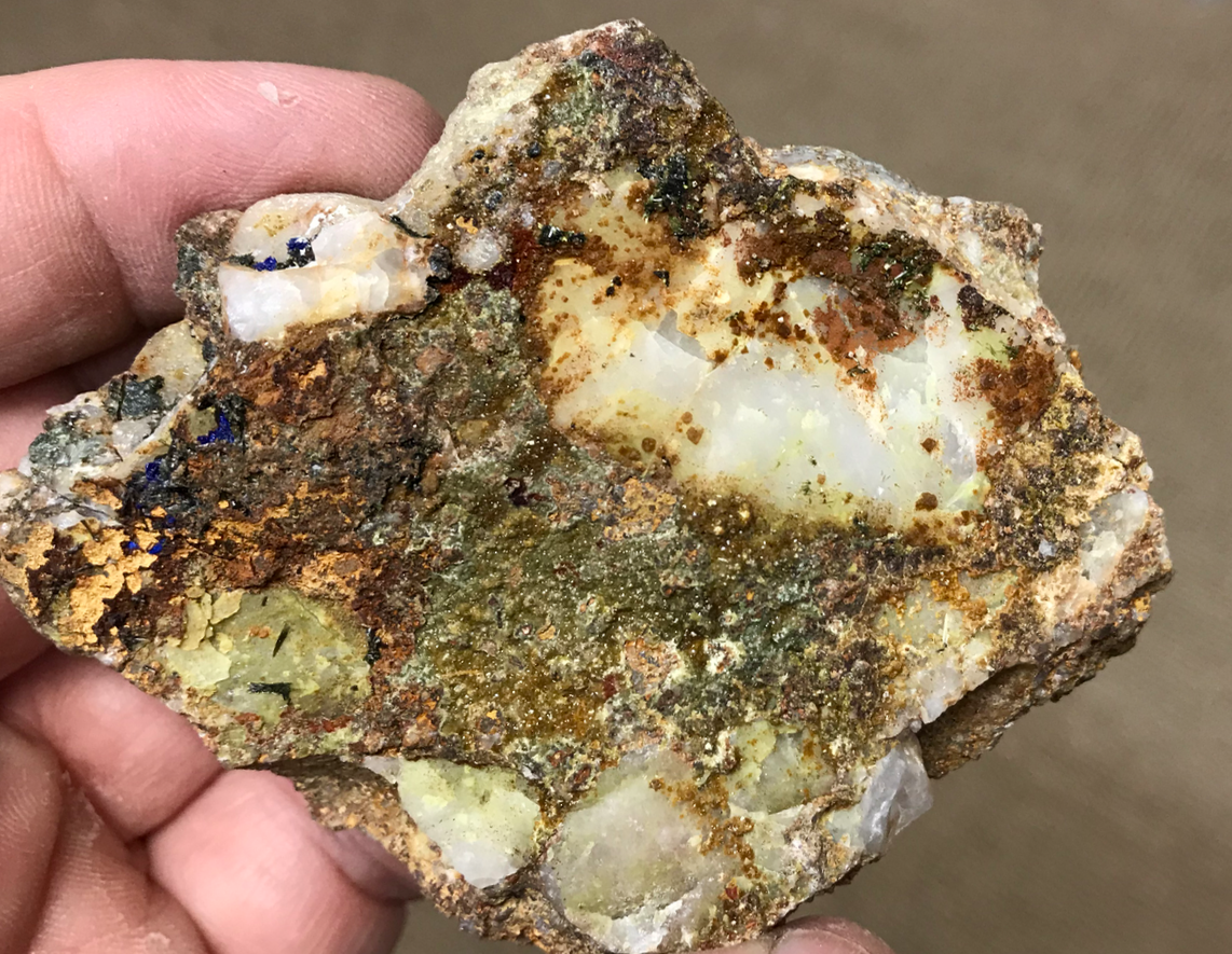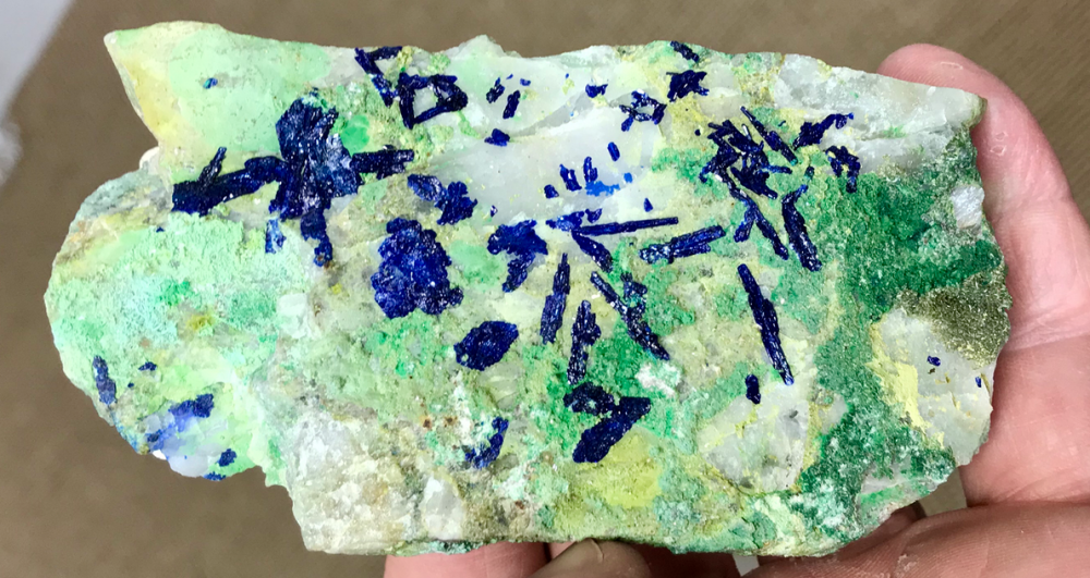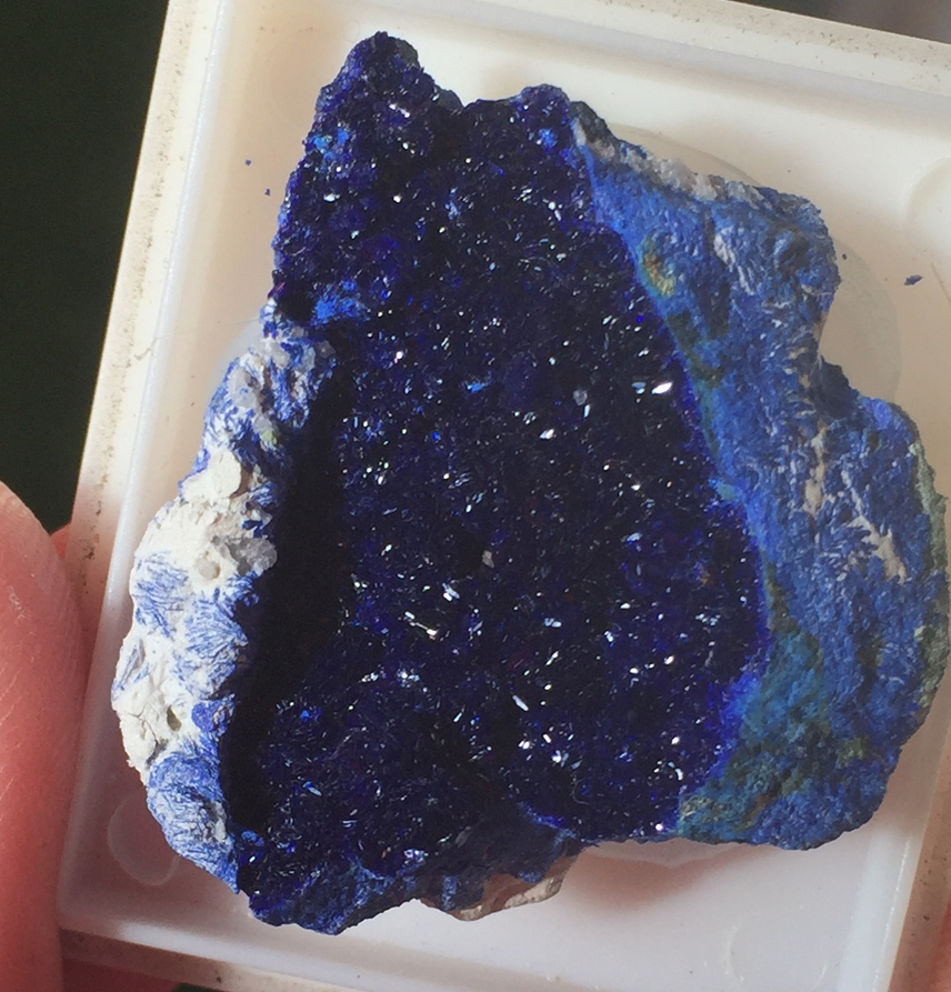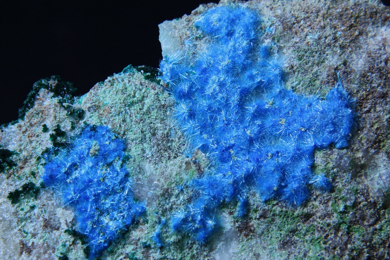 Superbe sujet, dans lequel j'ai personnellement découvert la diversité immense de ce gisement. Je viens tout juste d'acquérir le spécimen ci après, mais il va falloir que je le scrute à la bino pour rechercher peut être d'autres espèces que l'Azurite et Malachite ... ? je reviendrai surement avec d'autres photos macro pour vous demandez confirmation ... c'est l'une des richesse de ce forum !