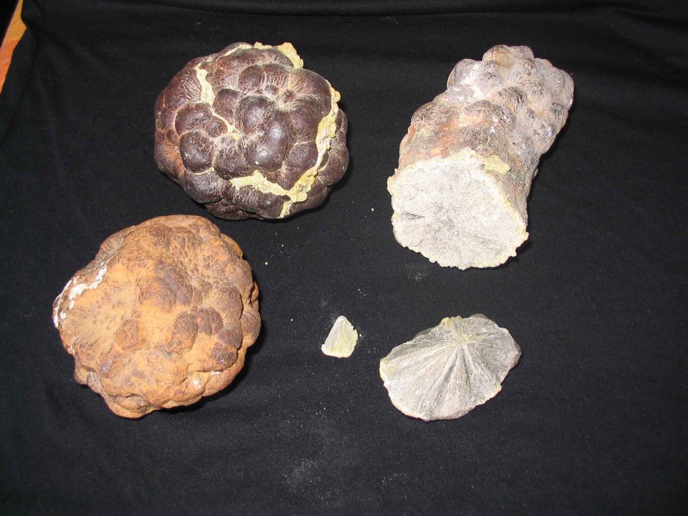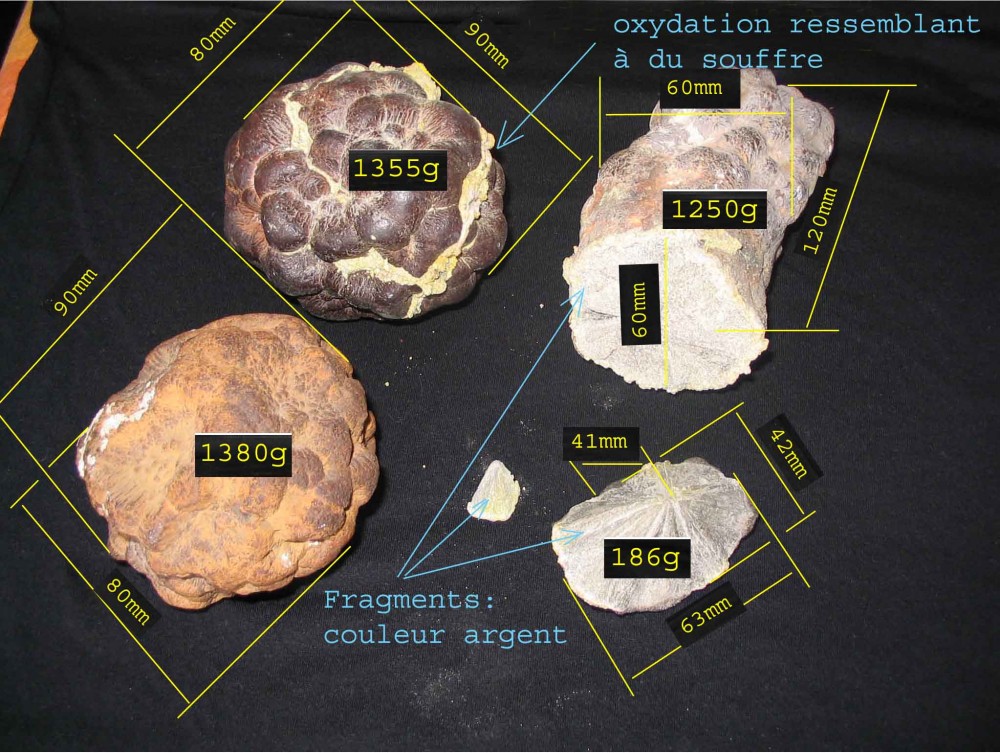 Au regard de leur masse conséquente, ces ‘boules’ de forme compacte ou étirée doivent être constituées d’une matière à forte densité. Leur croûte externe bosselée, de teinte sombre et mate, présente des ressemblances avec la ‘Pseudomalachite’, la ‘Limonite’ ou encore l’Uranite’. La structure interne est constituée de fibres argentées dont la particularité est de se rejoindre en son centre. L’analyse spectrale d’un fragment fait ressortir une forte concentration de sulfure de fer. Avec le temps et au contact de l’air ambiant, ces boules se fissurent et développent une oxydation poudreuse variant du gris au jaune dont l’odeur rappellent fortement l’oxyde de souffre. :question::siffler:post-1253-1163945982_thumb.jpg