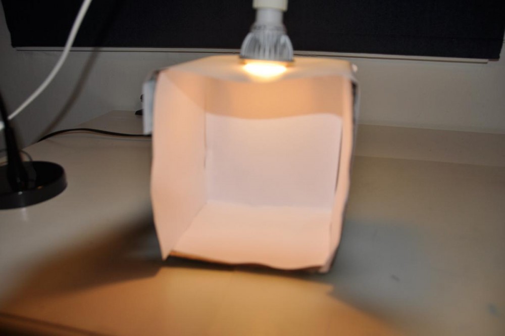 J'ai monté une petite boite à lumière un peu dans le même principe que Jeanjean. Elle est un peu plus grande (pack de six bières...) avec un feuille blanche courbée pur le fond et des feuille d'essuie tout pour les côtés et le haut afin de diffuser la lumière.