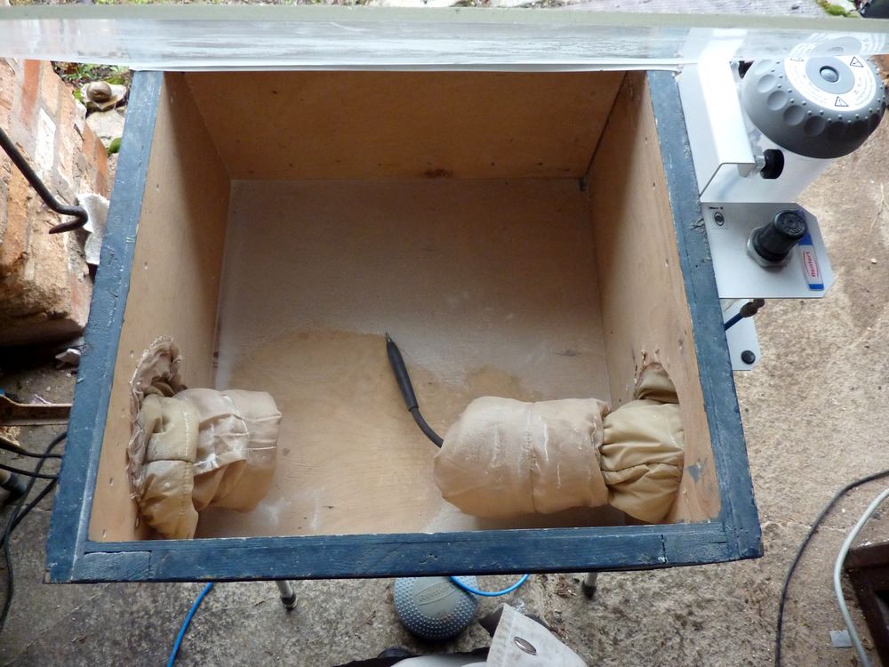 Pour ne pas sabler la nouvelle vitre je contourne le problème en scotchant dessus un film étirable alimentaire et je le renouvelle au bout de chaque journée de sablage. C'est plus facile de changer le film que de trouver une vitre aux bonnes dimensions.