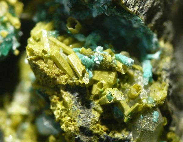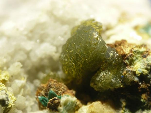 la qualité de ce coin mérite bien un post. Mimétite = jaune - Malachite = vert - Azurite = bleu - Quartz = blanc