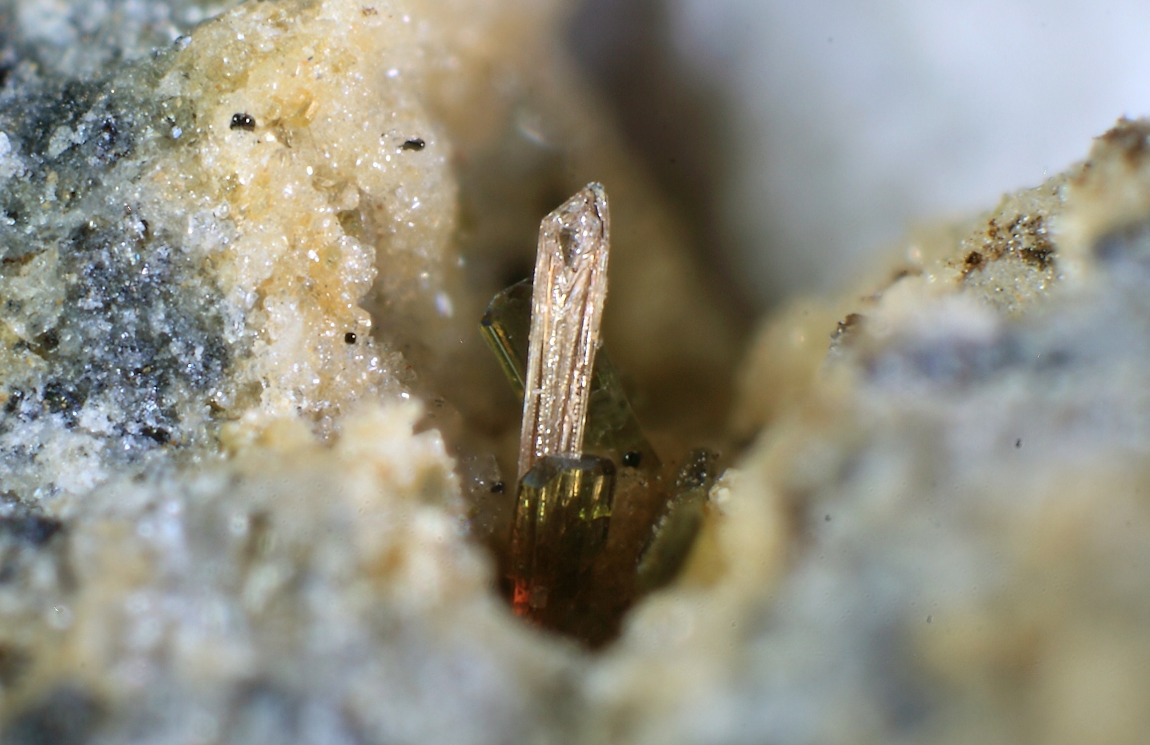 il y a de belles olivines et hematites dans ce type de cavité en association avec pseudo-brookite