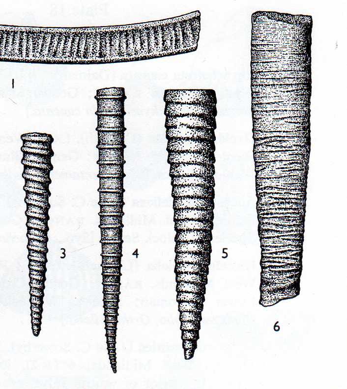 et 3,4,5,6: mais dans les vers du Silurien: tentaculites scalaris, Tentaculites ornatus, cornulites serpularius, keilorites lewisii