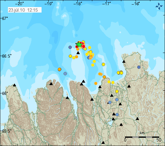 Je confirme ce qui a été écrit précédemment: il n'y a rien de volcanique autour de Grimsey ou de la péninsule de Tjornes. La région est une zone sismique très active, comme la presqu'île de Reykjanes au sud-ouest de l'Islande. Comme l'a écrit Robin, ce sont des zones de failles transformantes où s'affrontent deux segments de la dorsale. Sinon, le secteur de l'Ejafjallajökull et du Katla est calme. Les séismes que l'on enregistre de temps en temps sont très superficiels et ne correspondent en aucun cas à une montée de magma.