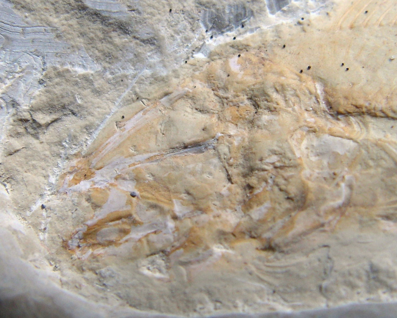 J'ai du mal à distinguer grand chose sur la tête de ton fossile. Peut-on y voir un interoperculaire? L'os maxillaire est-il mobile? (cependant je ne pense pas que même en vrai on puisse le distinguer). J'ai également débord pensé à une amie en raison de la nageoire dorsale et de la nageoire caudale, mais c'est un peu rapide de raisonner ainsi. Certains téléostéens en sont également dotés!