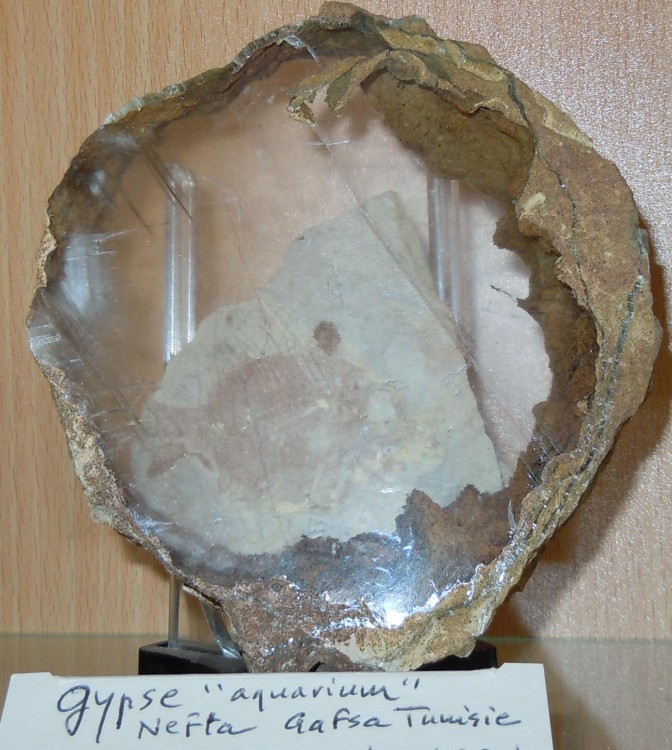 ces gypses ou sélénite très limpides (comme du verre) sont apparus en bourses sous le nom de gypse "aquarium" je me suis donc amusé à présenter cet échantillon avec un pensionnaire lui aussi fossile un Capros des Carpates, ainsi la dénomination "gypse aquarium" prend tout son sens; il faut bien de temps en temps donner un petit coup de pouce humoristique valorisant un type d'échantillon, non ? J'a jouterai la photo dès que possible.