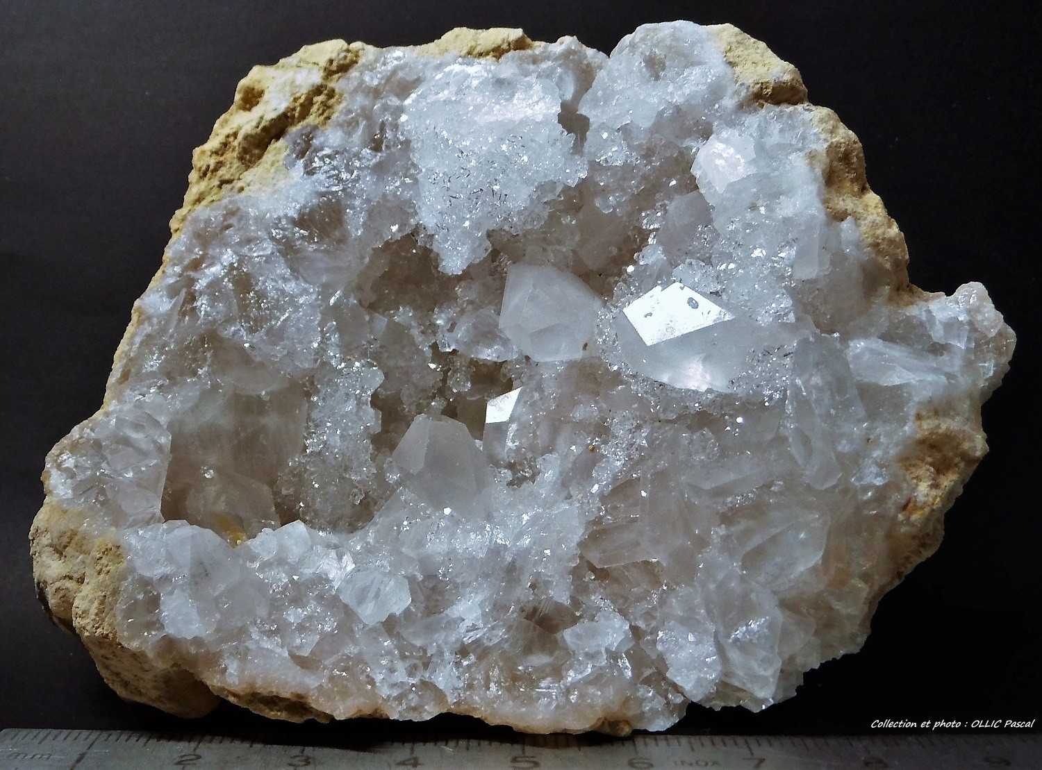 Une pièce que je trouve interessante : Barytine sur stalactite d'Aragonite (possibilité de faire une photo du dessous de la pièce montrant la structure stalactique si besoin) - Provient d'une découverte de 2003 à Hammam Zriba (pas d'autre découverte du même type ensuite à priori) - Tunisie - dimensions 7 x 6,5 x 6,5 cm - cristal le plus grand de barytine 2,3 cm.