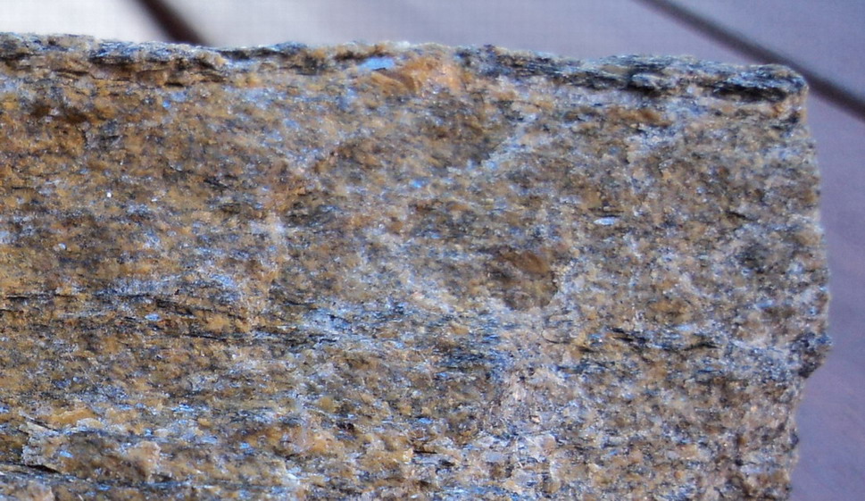 On dirait un micaschiste avec des lits de biotites pour certains frais (lits noirs - zoom cerclé) et d'autres altérés et verdatre (844 x 589 (199.87 Ko) : chloritisés