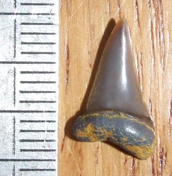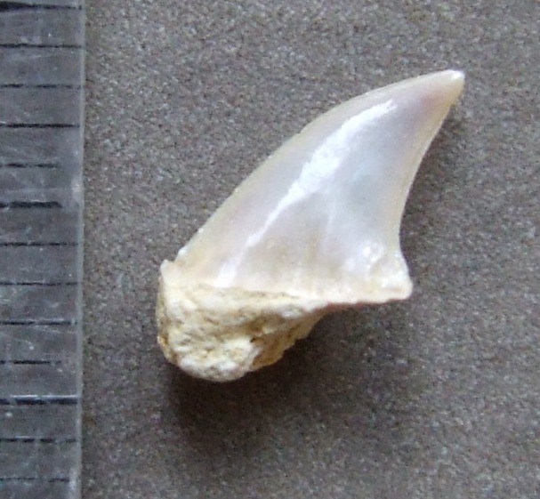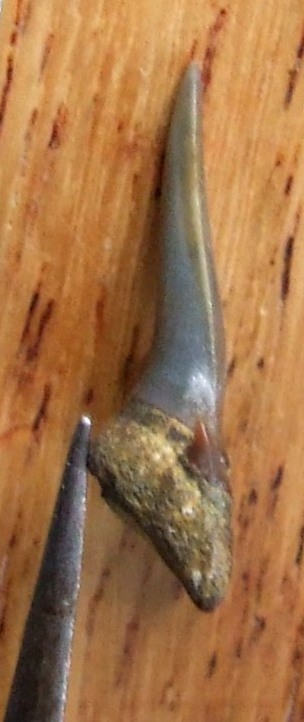 Si vous ne faites déjà pas une indigestion de requin, j'ai encore une dent à proposer à votre sagacité. Elle est curieusement vrillée à son extrèmité. Malformation ou état normal ? Elle n'est pas complète malheureusement, mais peut-être avez vous un avis dessus ?