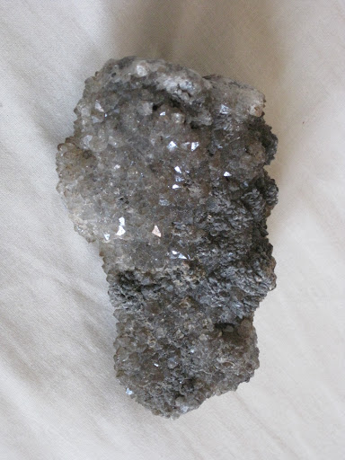 Le principal est un quartz fumé avec des inclusions cuivrés. Le coté "paillettes" vient des pointes et "creux" qui ont poussé dans les faces des cristaux. Ensuite il y a dessus il y a de la calcite opaque grise, parfois recouverte d'une croute de silice gris-beige opaque. D'où est-ce que ça vient?