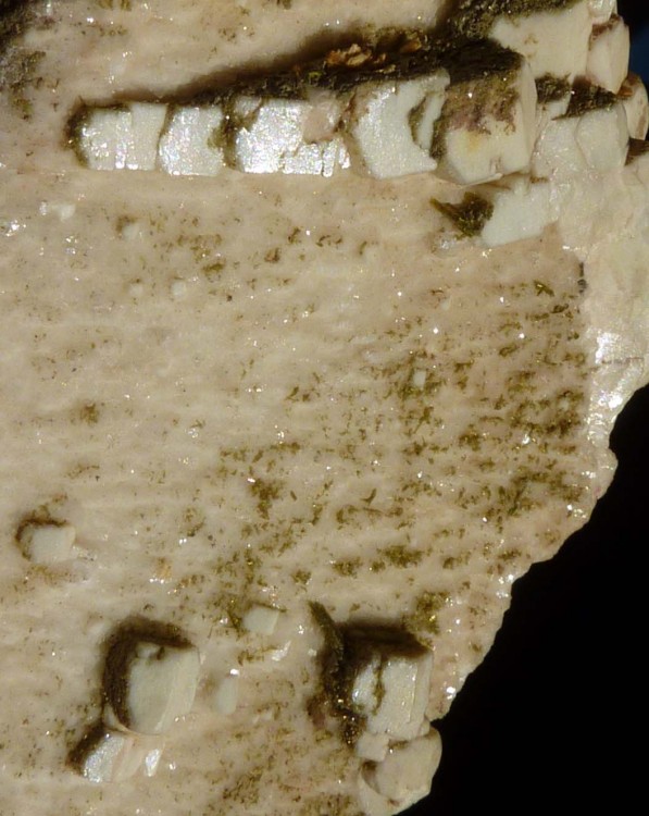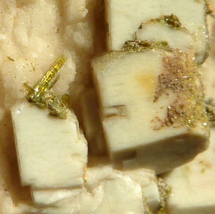 Sur l'échantillon on trouve de l'épidote, mais aussi un petit minéral orangé non identifié : si quelqu'un a une idée, merci. (pas de test possible)