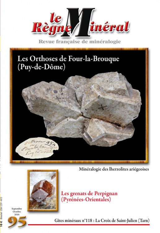 L’été s’achève mais le Règne Minéral est là aussi pour le prolonger à sa façon. Alors partons, avec ce numéro, dans le sud du département du Puy-de-Dôme à la rencontre des fameuses orthoses du vallon de Four-la-Brouque : un site minéralogique historique considéré comme l’un des plus beaux gisements de feldspath français, et l’un des sujets favoris de nombreux auteurs comme Gonnard, Bouillet, Lecoq, etc. Nous revenons ici sur ce petit gisement en apportant pas mal d’informations d’ordre historique et géologique, mais aussi la description d’échantillons anciens (figurés) que nous avons photographiés. Les diverses macles ou groupes de macles sont ici dévoilés, pour vous permettre de retrouver ces raretés sur le terrain.