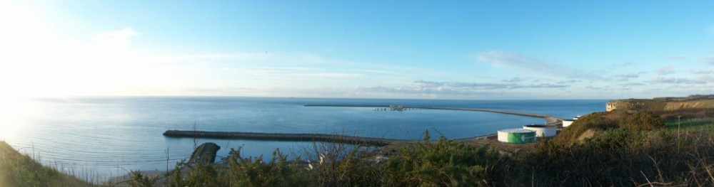 Bon je ne vous fais pas un gros discours, vous avez des info ici (http://fr.wikipedia.org/wiki/Antifer), bref un port pétrolier fait pour acceuillir les super tankeurs qui ne peuvent pas accéder au Havre, ici, les fonds permettent un tirant d'eau beaucoup plus important, donc à l'époque ils ont dit banco, ces gros bateaux vont se multiplier, c'est gagné. Manque de chance, ça courre pas les rues finalement, et donc très très peu utilisé, quand un pétrolier vient, c'est la fête, façon retour du Titanic, du France ou du Normandie. Un projet de réhabilitation en terminal méthanier est dans les cartons depuis longtemps. Pour vous dire les dimensions, la photo, je suis sur le haut de falaise, et le bout de la digue est à grosso merdo 3 km, elle est longue de 3,5 km pour des pétrolier de 450 m, des beaux pédalos.