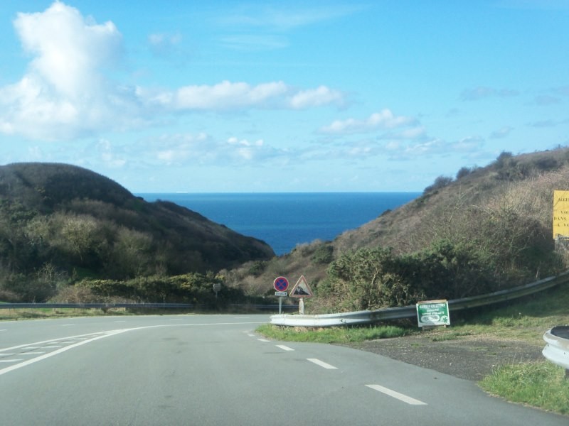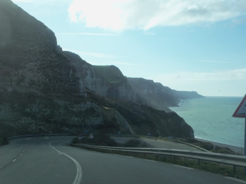 pour y accéder, une grande descente avec de beaux virages, qui font le bonheur des skatteurs de l'extrême qui descendent sans se soucier des voitures qui arrivent sans visibilité, et qui doivent au dernier moment aller bien mordre dans le talus pour en plus se faire invectiver par leurs collègues plus haut. Skatteurs comme on voit à la TV au zapping sauf que eux, sont torse-poil (bah oui, c’est bien connu que les côtes normandes en hiver, c'est un peu sea sex and sun mais avec un petit vent pour vous éviter de trop transpirer!) et aucune protection sur eux, ou au niveau des glissières de sécurité... bref des conscients quoi...