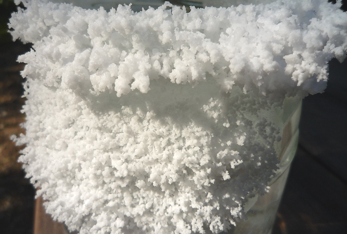 Au bout de quelques heures, un dépot de sel va se former sur les bords du bol puis plus tard, des cristaux vont apparaitre en surface.