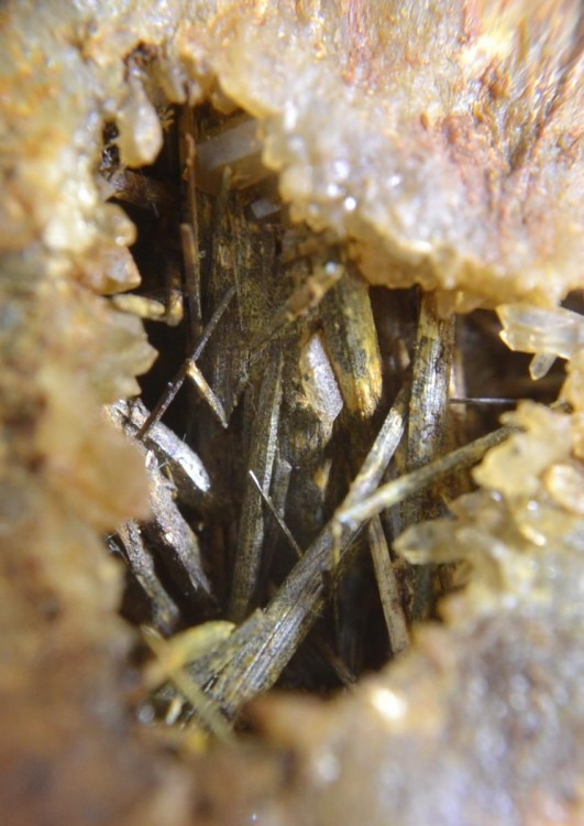 Phillipsite de la Grange de Ganilh (près de Murat, Cantal). faciès en boule et en cristaux isolés. La vacuole fait à peu près 3cm de long, à vue de nez...