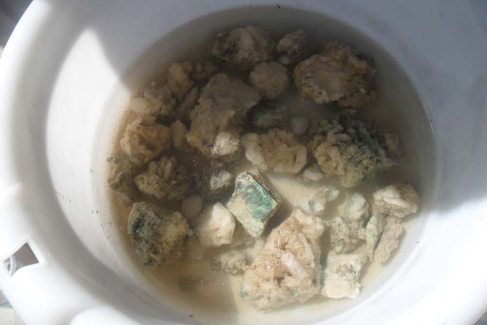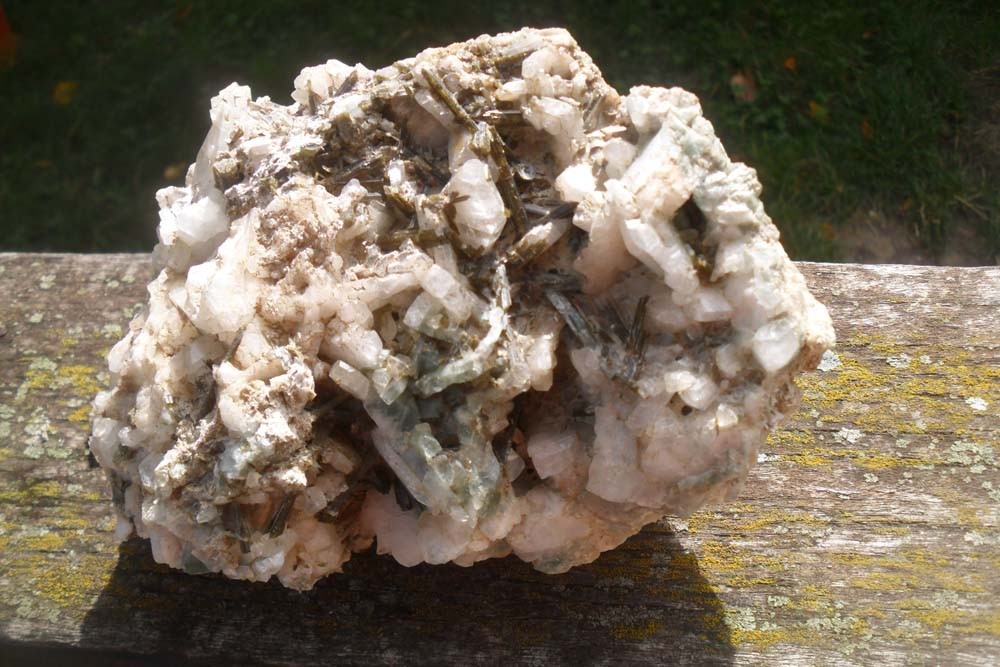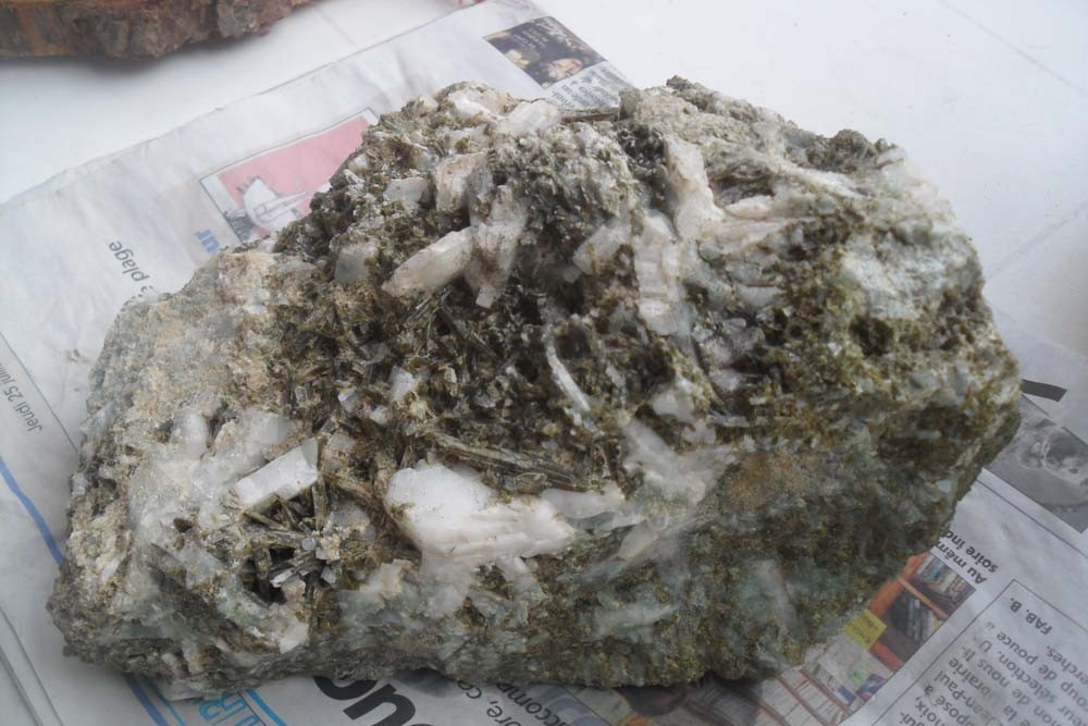 Au menu d'une ballade en altitude : épidote (cristaux jusqu'à 4 cm), albite blanche (jusqu'à 6 cm) et verte (3 cm), fuschite et "amiante". Voilà, tout ce petit monde trempe gentiment...